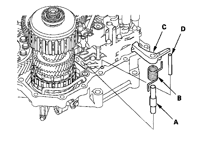 27. Install the park pawl shaft (A), pawl spring (B), park pawl (C), and park pawl stop (D).