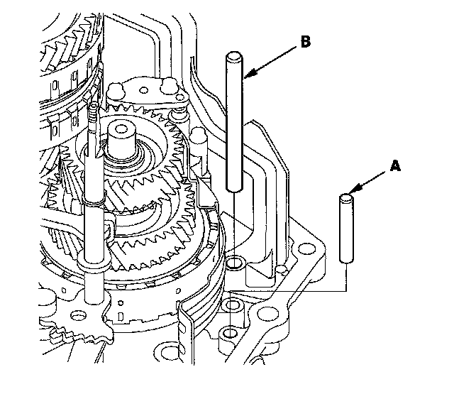 24. Turn the shift fork shaft (B) so the large chamfered hole is facing the fork bolt hole of the shift fork.