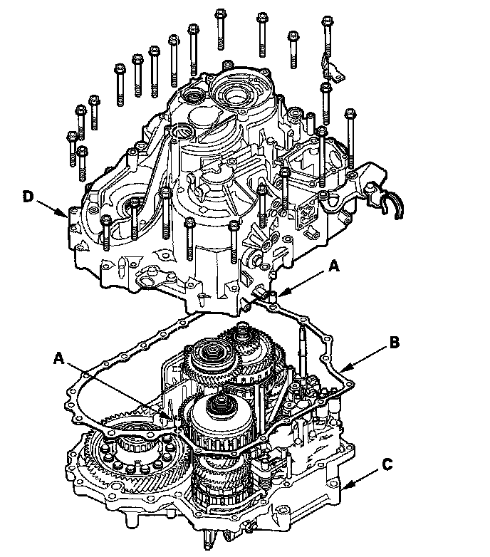 33. Place the transmission housing (D) on the torque converter housing.