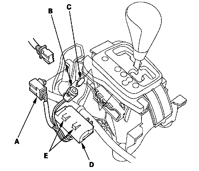 4. Remove the transmission gear selection switch/park pin switch (D) by releasing the lock tabs (E).