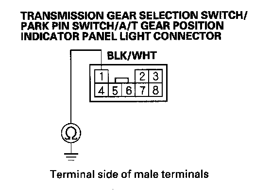 13. Check for continuity between transmission gear selection switch/park pin switch/A/T gear position indicator panel light connector terminal No. 1 and body ground.