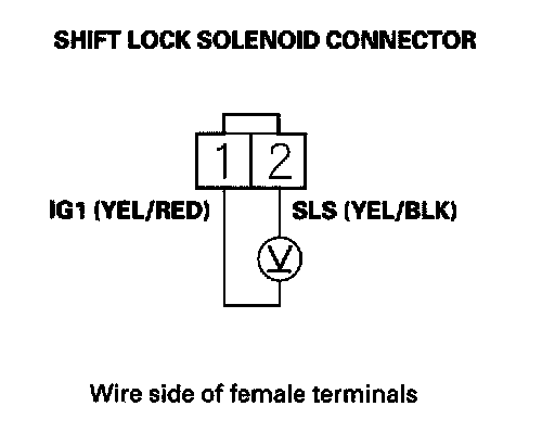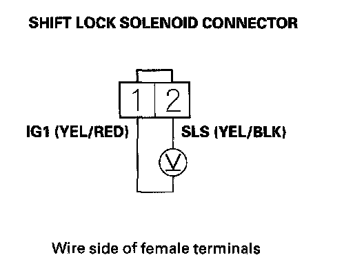 9. Release the brake pedal, and measure the voltage between shift lock solenoid connector terminals No. 1 and No. 2. The shift lever must be in the P position.