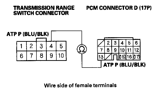 27. Check for continuity between PCM connector terminal D13 and transmission range switch connector terminal No. 4.