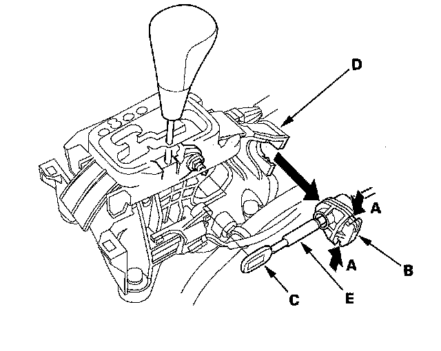 4. Press the holder lock release (A), and pull out the socket holder (B) to remove the shift cable (C) from the shift lever bracket base (D). Do not remove the shift cable by pulling the shift cable guide (E).