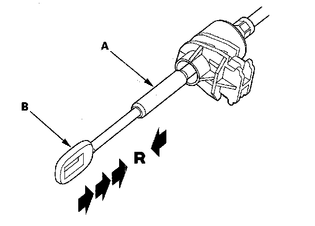 5. Push the shift cable until it stops, then release it. Pull the shift cable back one step so that the shift position is in R. Do not hold the shift cable guide (A) to adjust the shift cable (B).