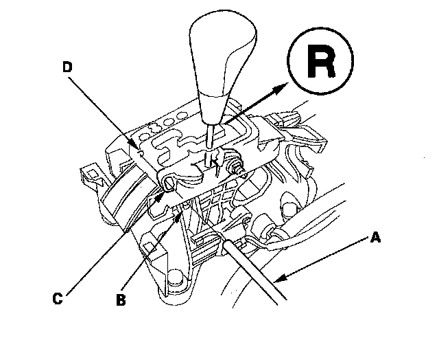 8. Place the shift lever in the R position, then insert a 6.0 x 100.0 mm (0.24 x 3.94 in.) pin (A) through the positioning hole (B) on the shift lever bracket base, through the positioning hole (C) on the shift lever, and into the Positioning hole (D) on the shift lever bracket base. The shift lever is secured in the R position.
