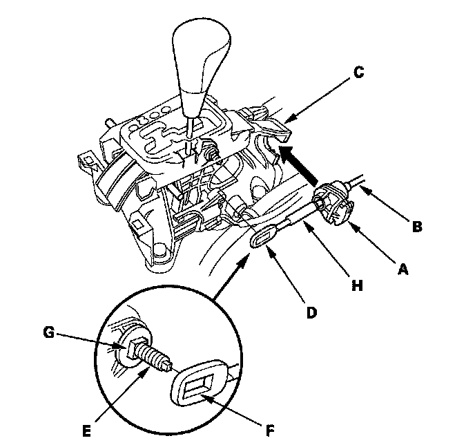 9. Align the socket holder (A) on the shift cable (B) with the slot in the bracket base (C), then slide the holder into base. Install the shift cable end (D) over the mounting stud (E) by aligning its square hole (F) with the square fitting (G) at the bottom of the stud. Push the holder until it snaps securely in place. Do not install the shift cable by holding the shift cable guide (H).