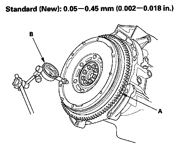 3. Measure flywheel (A) runout using a dial indicator (B) through at least two full turns with the engine installed. Push against the flywheel each time you turn it to take up the crankshaft thrust washer clearance. If the runout is not within the standard, replace the flywheel, and recheck the runout. Resurfacing the flywheel is not recommended.