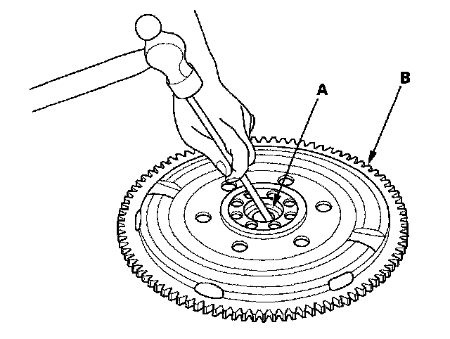 6. Install the ring gear holder (A), then torque the flywheel mounting bolts (B) in a crisscross pattern in several steps,