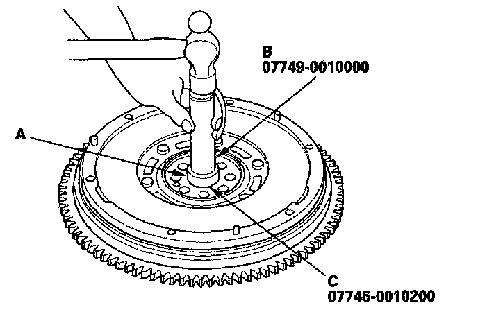 4. Install the new pilot bearing (A) into the flywheel using the driver (B), attachment, 37 x 40 mm (C). Apply a light coat of oil to the bearing outer surface.