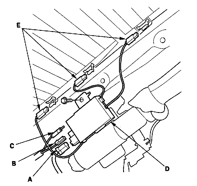 2. Disconnect the 1P connector (A), 1P connector (B), and AM/FM antenna lead (C) from the AM/FM antenna amplifier-rear window defogger coil (D) and the three window connectors (E).