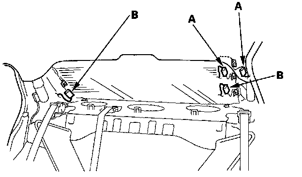 4. Pull down the rear portion of the headliner (A) by detaching the clips (B). Take care not to bend the headliner excessively, or you may crease or break it.