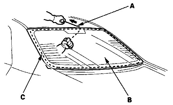 7. With a helper on the outside, pull the piano wire (A) back and forth in a sawing motion. Hold the piano wire as close to the rear window (B) as possible to prevent damage to the body, and carefully cut through the adhesive (C) around the entire rear window.