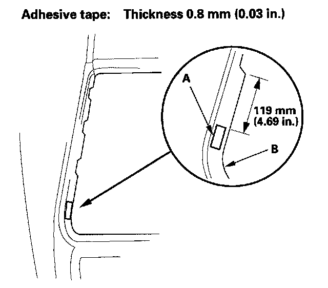 14. Attach the fasteners (A) with adhesive tape to the rear window opening flange (B) of the body on both sides.