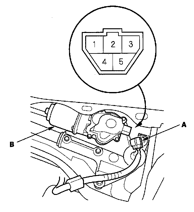 3. Disconnect the 5P connector (A) from the wiper motor (B).