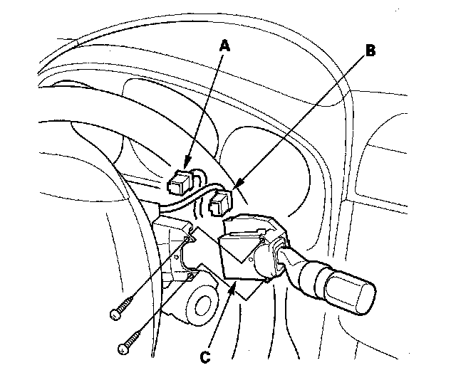 3. Disconnect the combination light switch 12P connector (A) and dashboard wire harness 8P connector (B) from the wiper/washer switch (C).