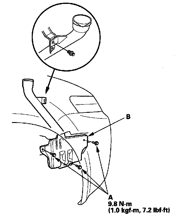 3. Remove the clip and three bolts (A), then remove the washer reservoir (B).