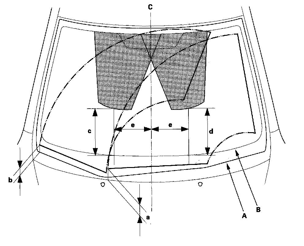 c: Position at about 295 mm (11.6 in.) from the top of black ceramic (B) at lower windshield