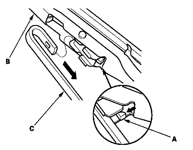 2. Press and hold the tab (A) and slide the wiper blade (B) toward the tab until it releases from the wiper arm (C).