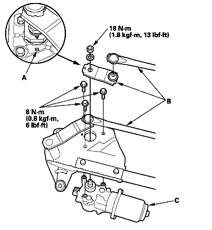 6. Scribe a line (A) across the link and windshield wiper linkage to show the original adjustment. Separate the windshield wiper linkage (B) from the wiper motor (C).