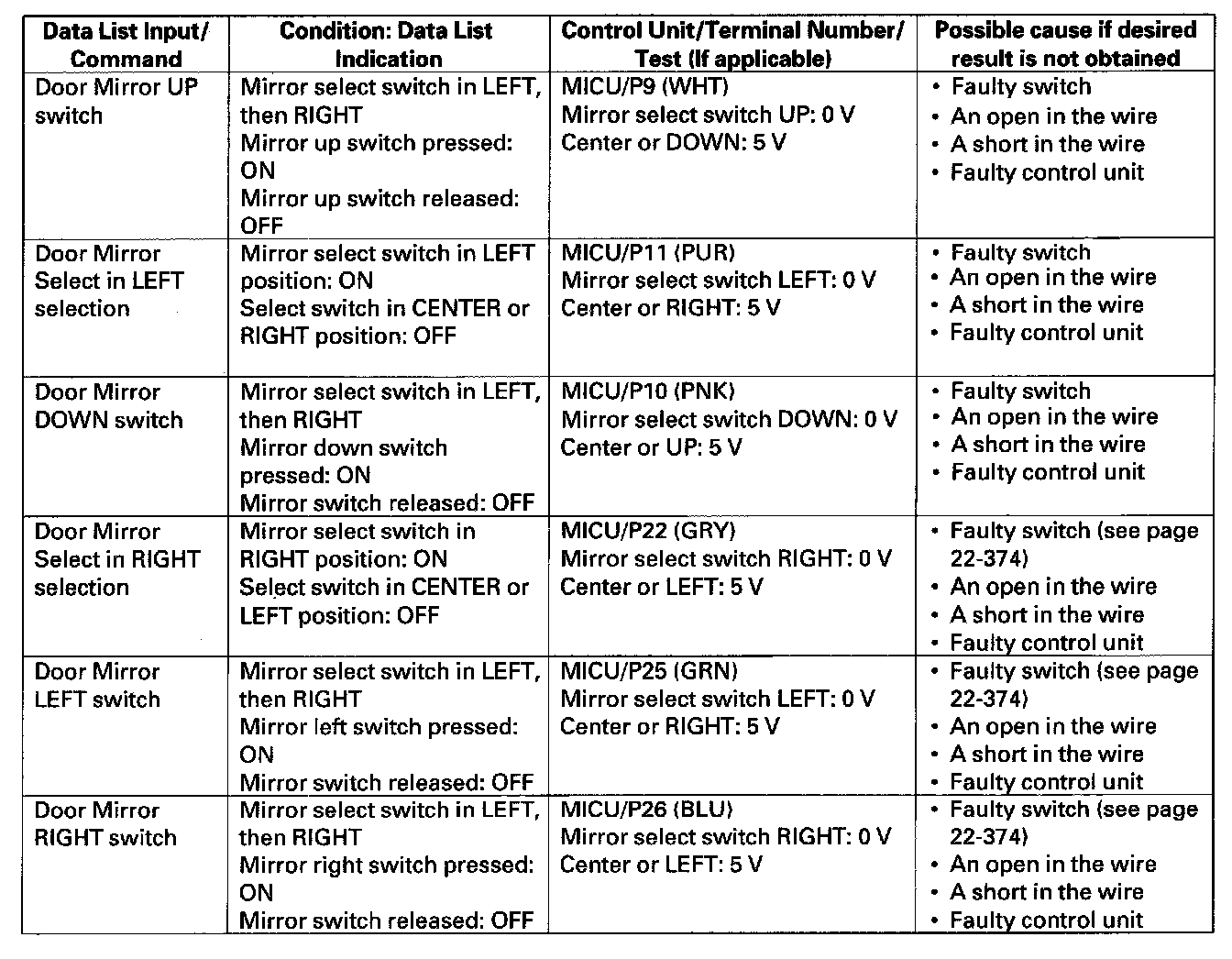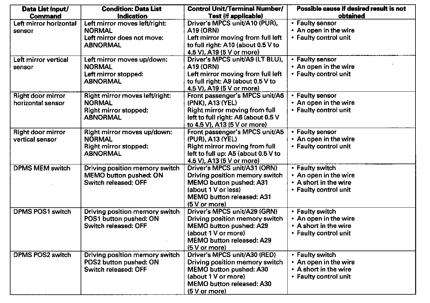 - If the test indicates that the component does not operate normally, check for an open or short in the harnesses between the component and the control unit. If the harness is OK, replace the component.