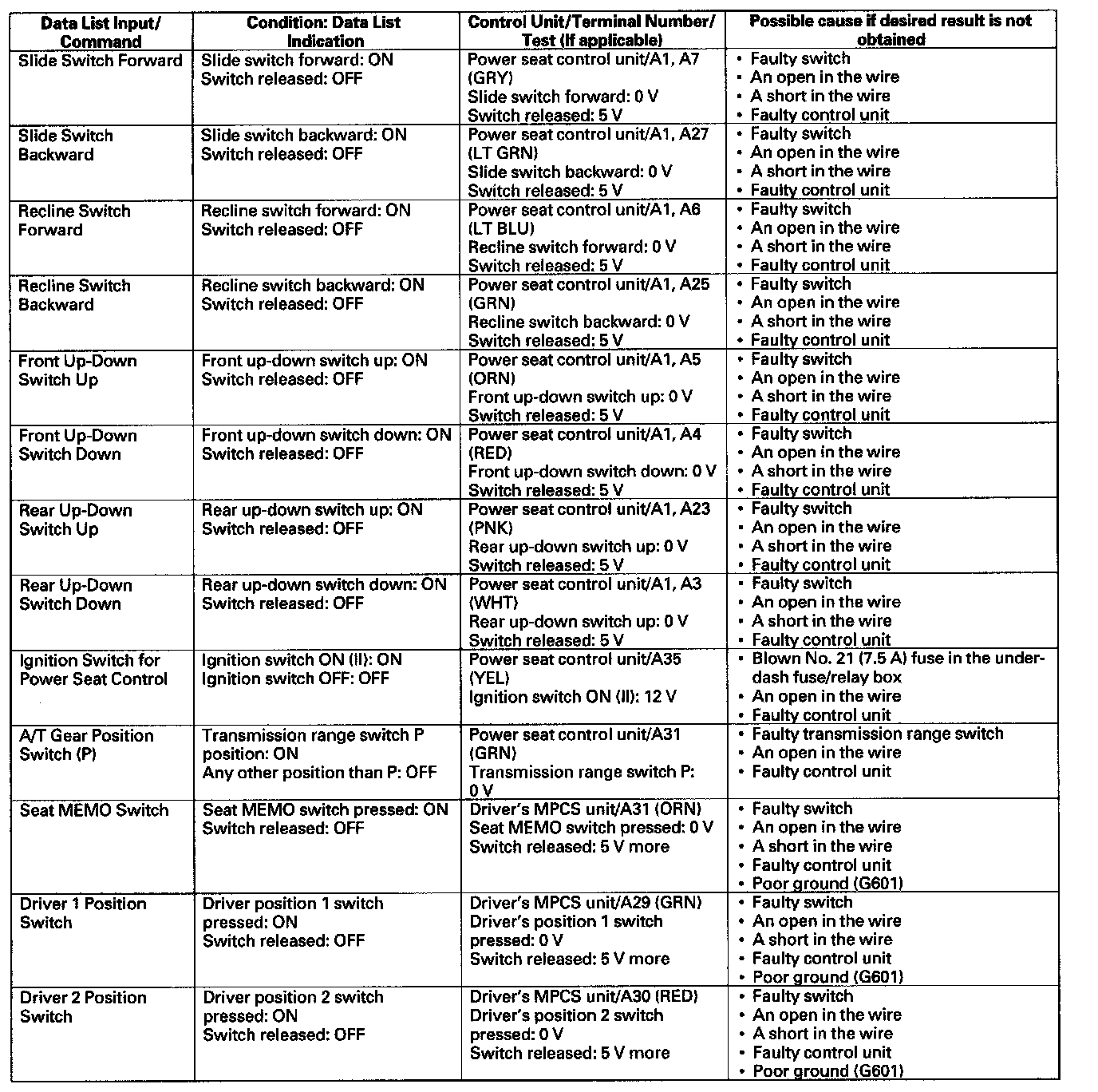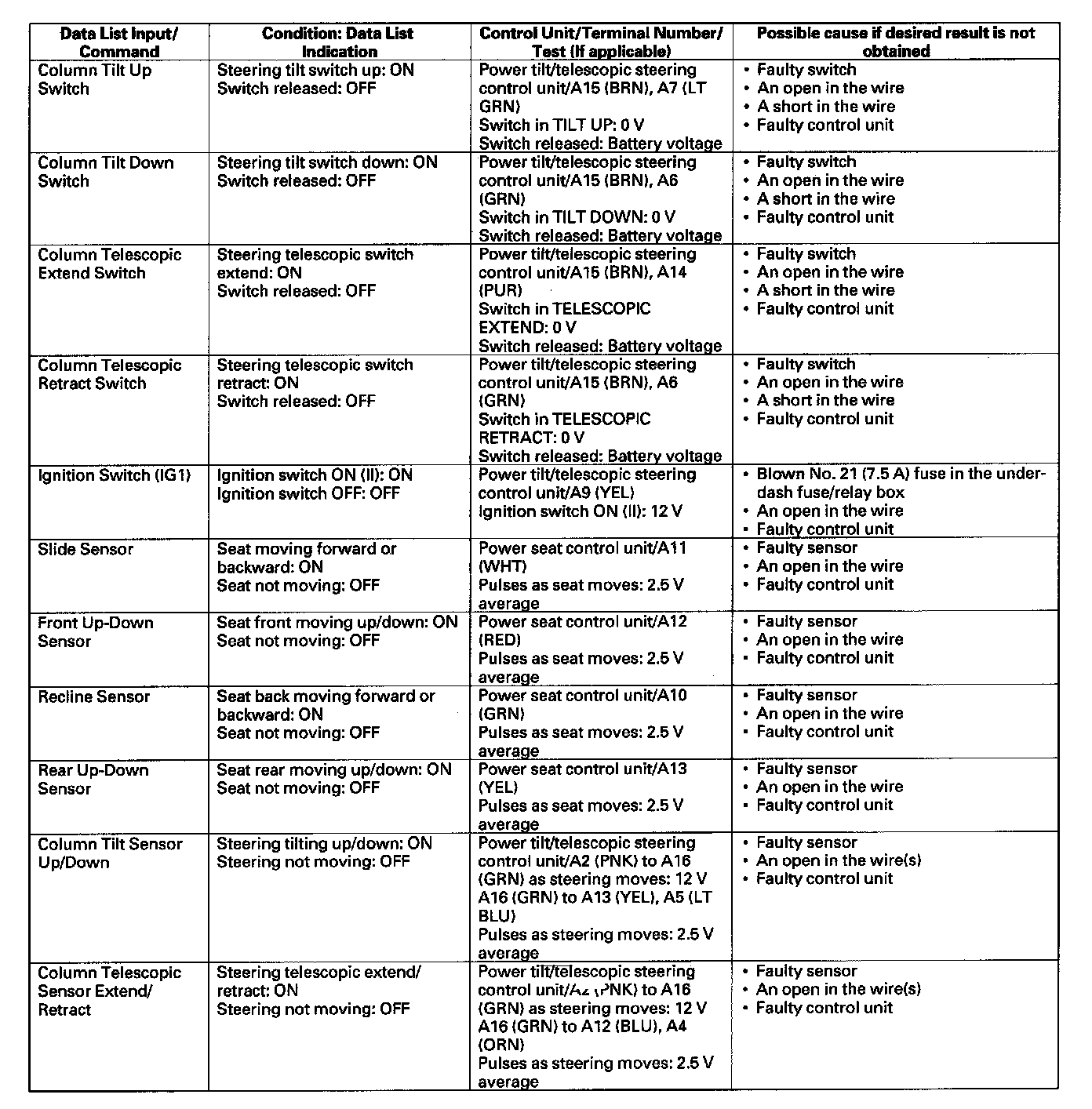 - If the data list indication is not correct, do the appropriate test at the control unit and terminal indicated in the table.