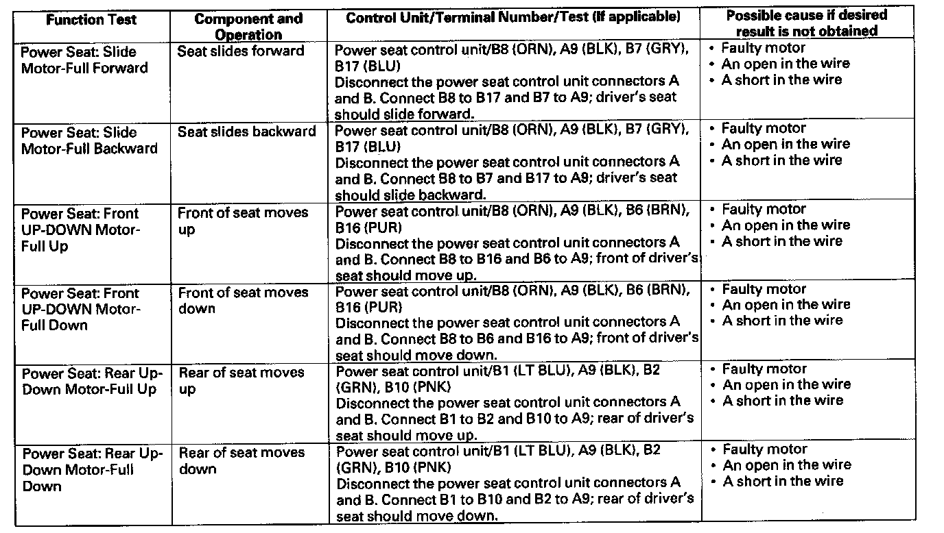 - If the function does not occur, do the appropriate test at the control unit and terminal indicated in the table.