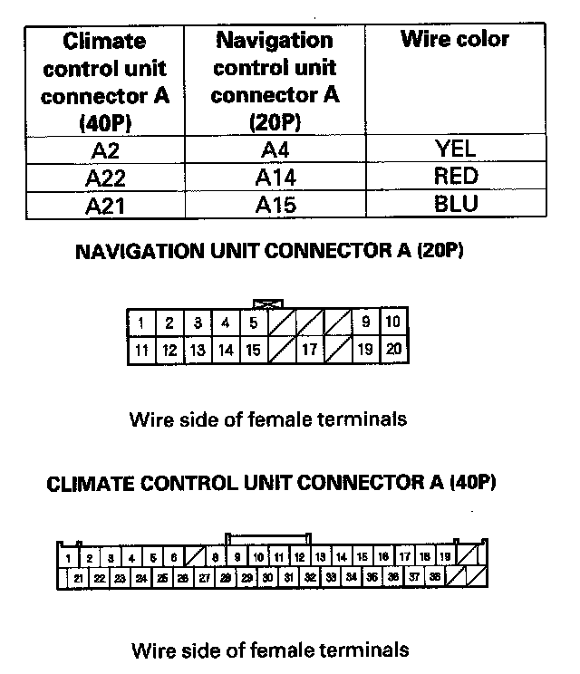 4. Check for continuity between climate control unit connector A (40P) and navigation unit connector A (20P) according to the table.