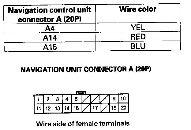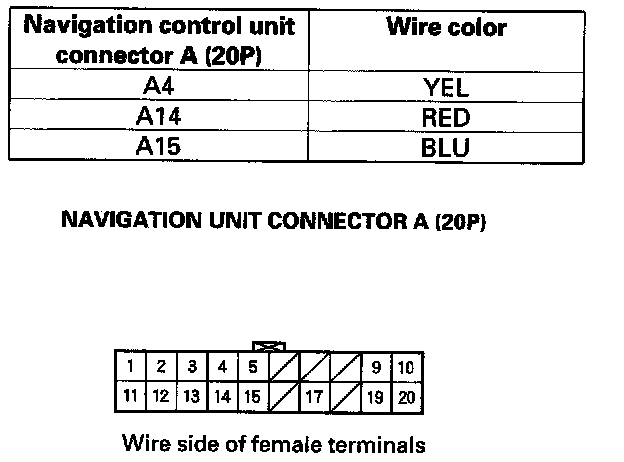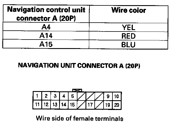 5. Check for continuity between each wire in the navigation unit connector A (20P) according to the table.
