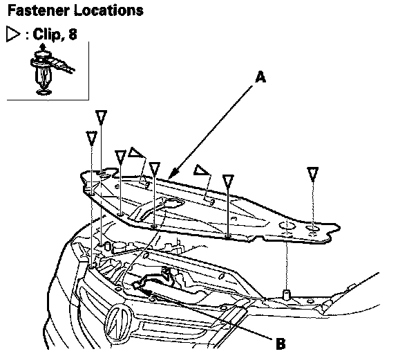 2. Pass the hood latch knob (B) through the hole in the cover.