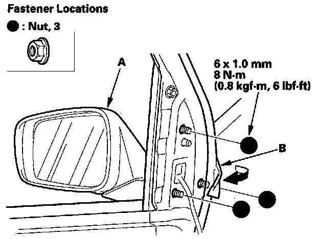 3. While holding the mirror (A), pull back the door weatherstrip (B) as needed, then remove the nuts.