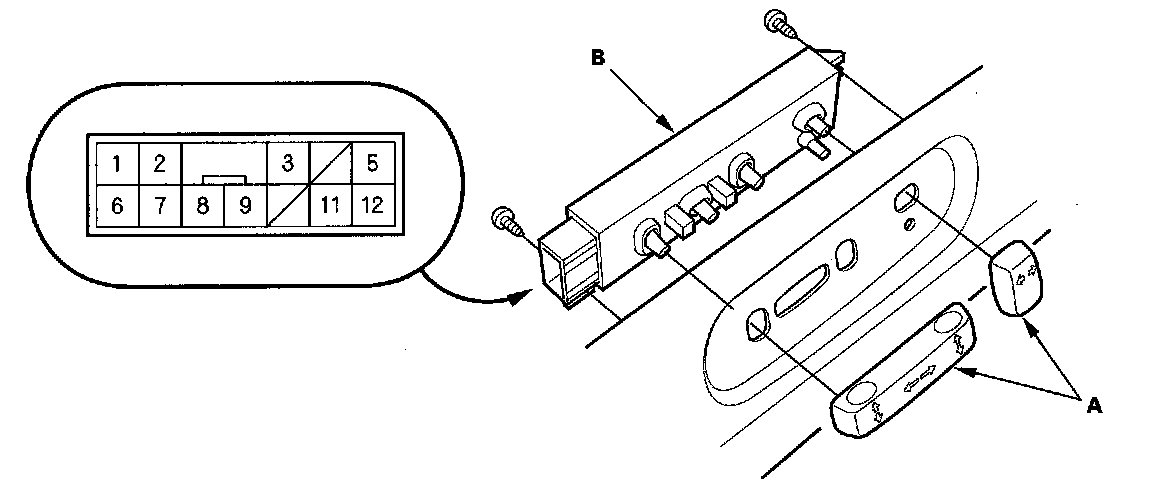 1. Remove the power seat adjustment switch knobs (A) and recline cover from the driver's power seat, then remove the two screws and the power seat adjustment switch (B).