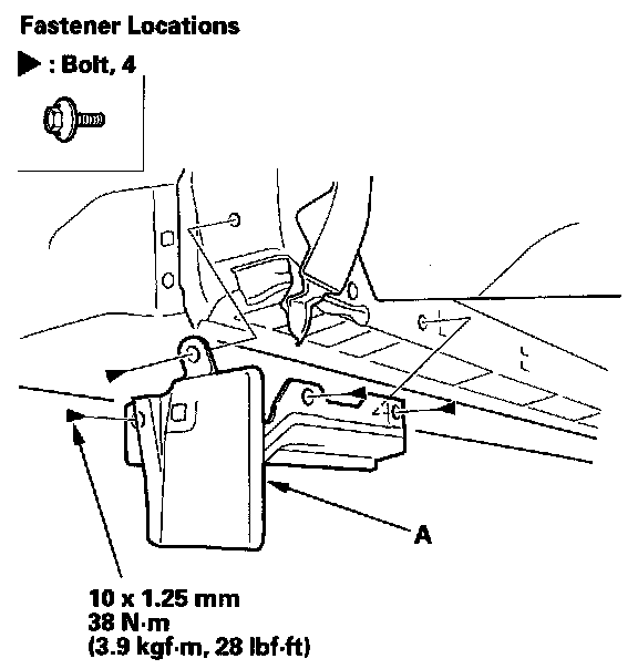 2. Remove the bolts, then remove the left front splash guard reinforcement (A). Take care not to scratch the body.