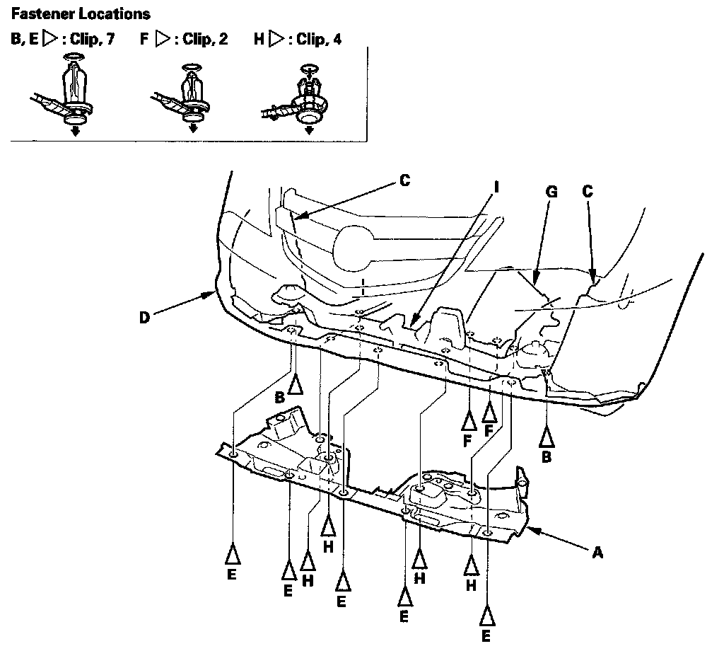 3. From under the body, remove the clips (F) that secure the front undercover (G) and splash shield, and remove the clips (H) that secure the splash shield on the front suspension subframe (I).