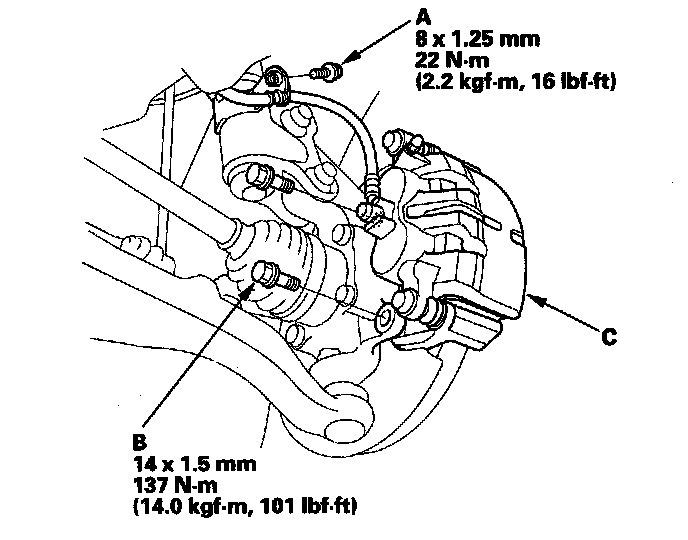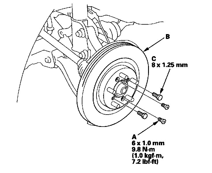 NOTE: If the brake disc is stuck to the hub bearing unit, thread two 8 x 1.25 mm bolts (C) into the brake disc to push it away from the hub bearing unit. Turn each bolt 90 degrees to prevent the brake disc from binding.
