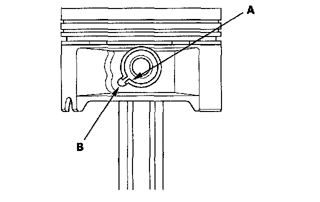 2. Apply new engine oil to the piston pin snap rings (A) and turn them in the ring grooves until the end gaps are lined up with the cutouts in the piston pin bores (B).
