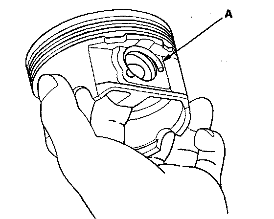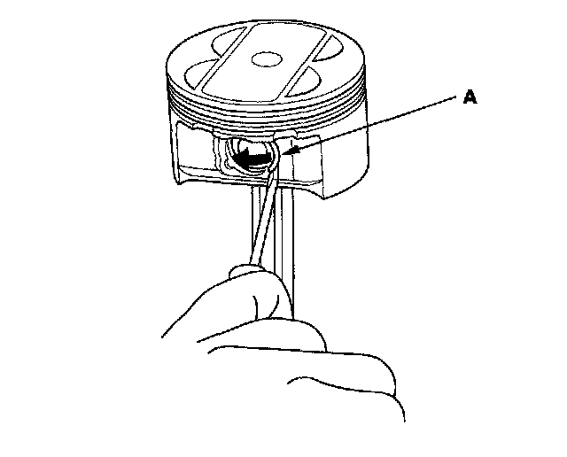 3. Remove snap rings (A) from both sides of the piston. Start at the cutout in the piston pin bore. Remove the snap rings carefully so they do not go flying or get lost. Wear eye protection.