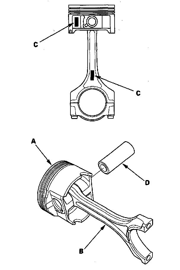 4. Assemble the piston (A) and connecting rod (B) with the embossed marks (C) on the same side. Install the piston pin (D).
