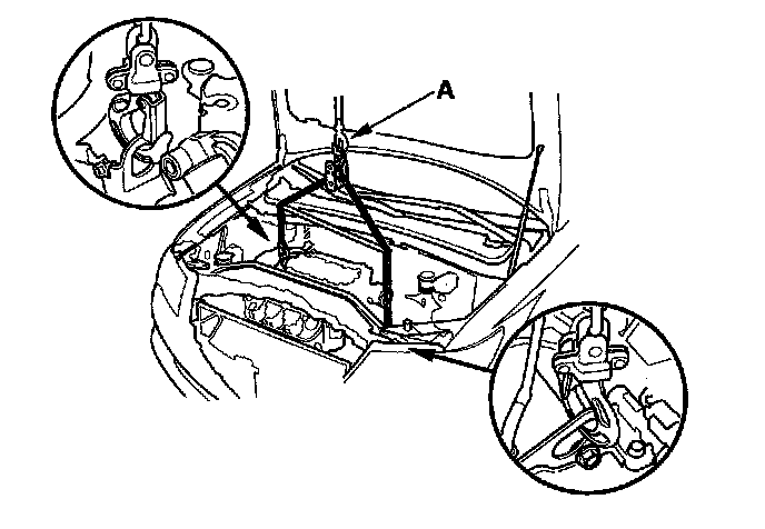 2. Position the engine/transmission under the vehicle. Be sure that they are properly aligned. Carefully lower the vehicle until the engine and transmission are properly positioned in the engine compartment. Make sure the vehicle is not resting on any part of the engine or transmission. Lift and support the engine with a chain hoist (A), and carefully raise the engine/transmission into place.