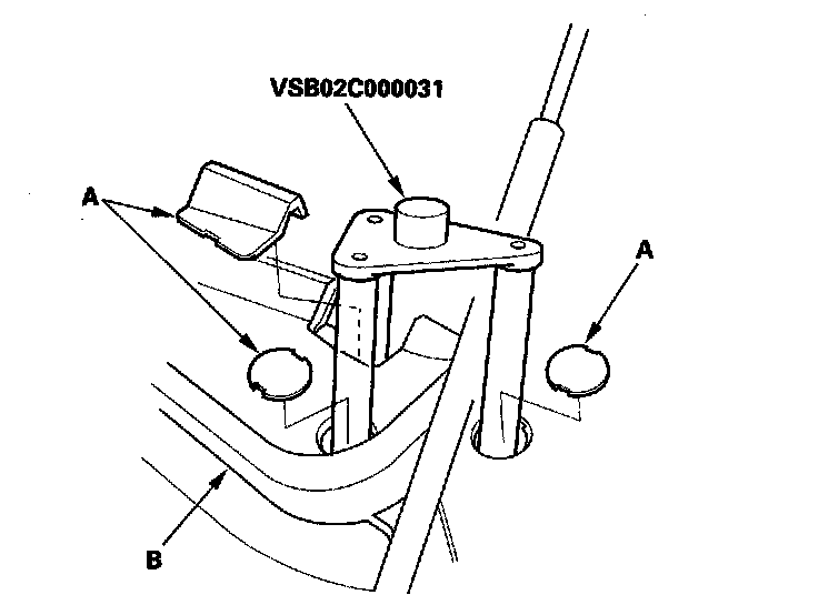 4. Install the engine hanger balance bar (VSB02C000019); attach the front arm (A) to the front cylinder head with a spacer (B) and 10 x 1.25 mm bolt (C), attach the rear arm (D) to the rear cylinder head with 8 x 1.25 mm bolt (E).