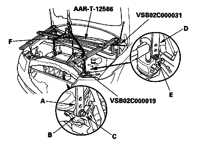 5. Install the engine support hanger (AAR-T-12566) to the vehicle, and attach the hook to the slotted hole in the engine hanger balance bar. Tighten the wing nut (F) by hand to lift and support the engine/transmission.