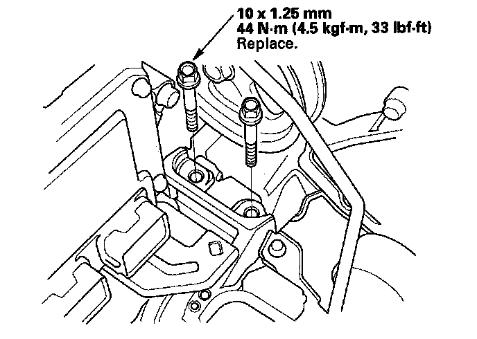 6. Install new mounting bolts into the upper half of the side engine mount bracket. Tighten the bolts to the specified torque.
