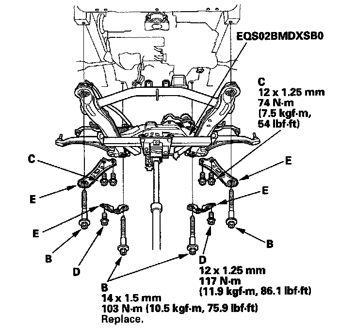 9. Loosely install the new front subframe mounting bolts (four) (B), the 12 x 1.25 mm bolts (six) (C) (D), and the stiffeners (E).
