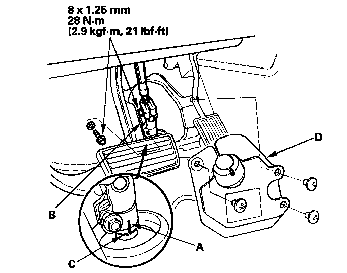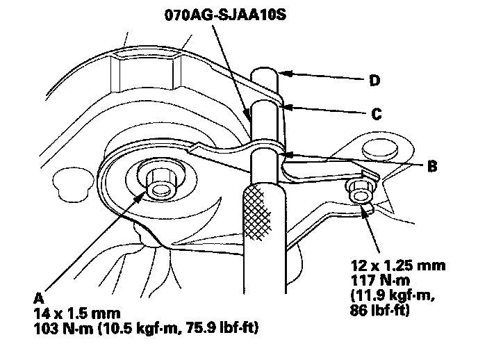 10. Loosely tighten the right rear subframe mounting bolt (A); insert the frame positioning guide pin (070AG-SJAA10S) through the positioning hole (B) on the rear stiffener, through the positioning hole (C) on the subframe, and into the positioning hole (D) on the body, then tighten the subframe mounting bolt.