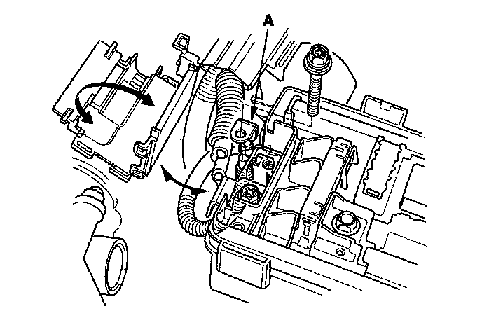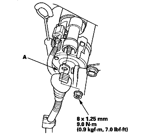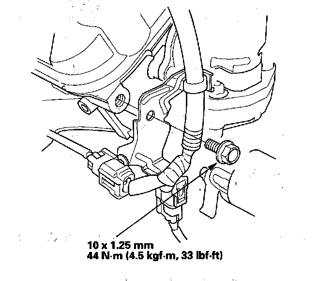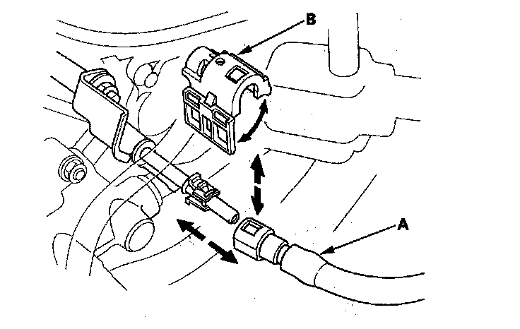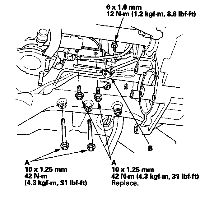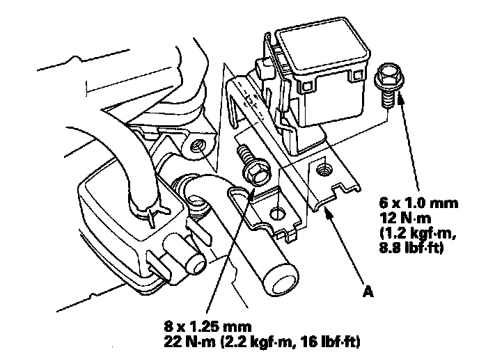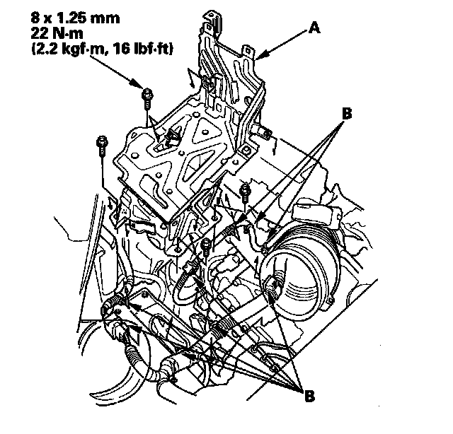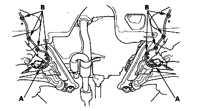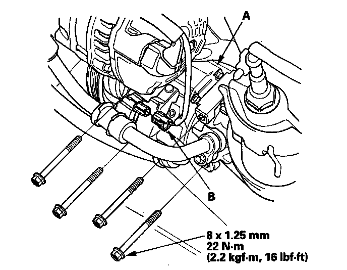 21. Tighten the front mount bolts (A), then connect the front engine mount control solenoid valve tube (B).