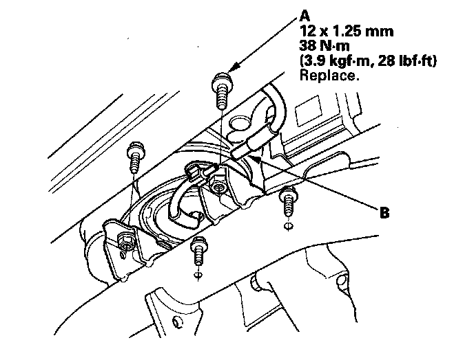 20. Tighten the rear mount bolts (A) and power steering line bracket (B).