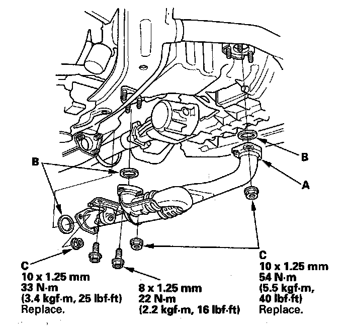 36. Install exhaust pipe A using new gaskets (B) and new self-locking nuts (C).