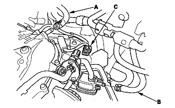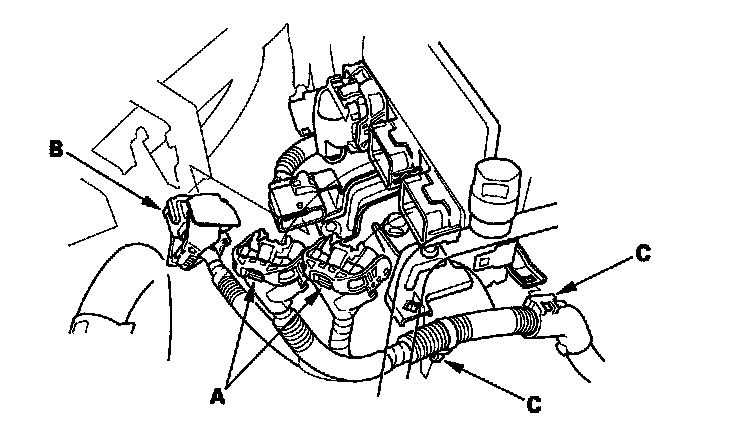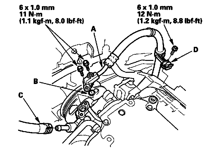 47. Install the power steering (P/S) pump outlet hose (A) with a new O-ring (B), and install the P/S pump inlet hose (C).