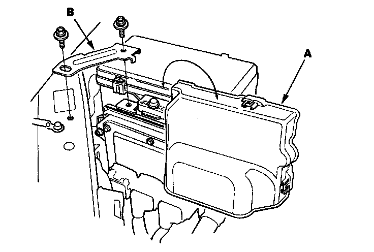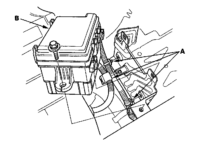 63. Install the harness clamps (A), then install the main under-hood fuse box (B).