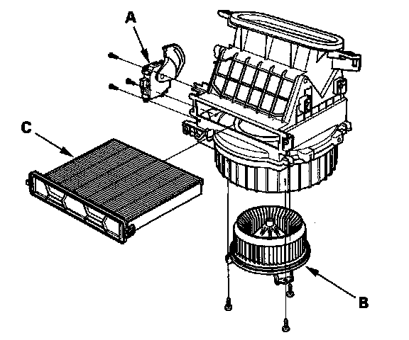 - The recirculation control motor (A), front blower motor (B) and the dust and pollen filter (C) can be replaced without removing the blower unit.